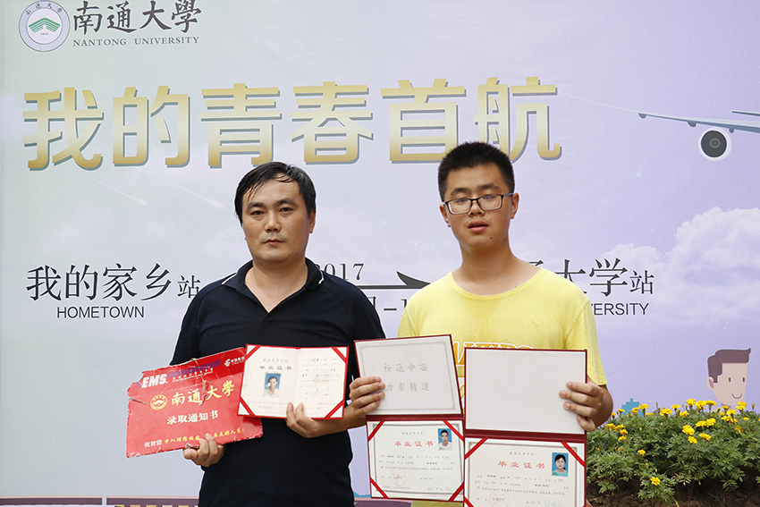 今年我院2017级的迎新工作还因为两位特别学生的到来受到了南通电视台、南通日报、南通周刊等新闻媒体的广泛关注。其中来自通州的新生葛剑波可谓是与南通大学有着不解之缘。报到当天,他随身带着一张父亲的毕业证书,引起了现场师生的热议。原来葛剑波的父亲王葛军在1995年考入原南通师专,攻读体育专业。与此同时,葛剑波的舅舅、舅妈也曾就读于通大,他的堂爷爷还曾在原南通师专物理系工作过,可谓一家都是通大的铁杆粉。如今葛剑波自己也加入了通大大家庭,立志要为通大的发展贡献一份自己的力量。另外一位引发广泛关注的学生是来自贵州六盘水的陈旷宇。这位拥有神秘身份“穿青人”的陈同学每次都乐于向大家介绍自己的民族,那是我国56个民族以外还未被识别的民族,至今还保留着许多独特的民族习俗。他的到来也印证了通大校园文化的多元与包容。