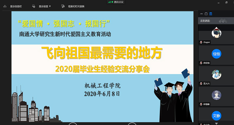 6月8日下午,机械工程学院开展研究生爱国主义线上主题教育活动——“飞向祖国最需要的地方”2020届毕业生经验交流分享会。