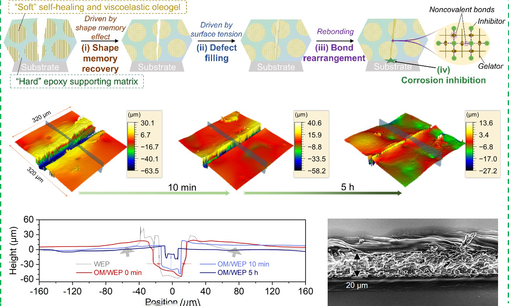本征自修复涂层具有实施简便、成本低廉、可重复自修复等优点,是高可靠防腐蚀技术的理想候选材料。由于其链段在环境条件下被锁定,大多数此类涂层的自修复需要干预才能启动。受大自然软硬混合多层级生物组织启发,团队提出了一种 “软+硬 ”混合架构设计策略,通过在“硬”的水性环氧基质中嵌入“软”的自愈合、粘弹性的油凝胶微球,制备了具有室温下可重复自愈合的油凝胶基防护涂层。这种解耦设计既能在没有外部刺激的情况下实现瞬时愈合,又具有良好的机械性能。油凝胶还具有生物防污、界面拒水和缓蚀剂装载释放等特性,使涂层不仅具有自愈合能力,还具有卓越的腐蚀防护性能。这项工作展示了将室温可重复自愈和良好机械强度整合到未来涂层设计中的可行方法。