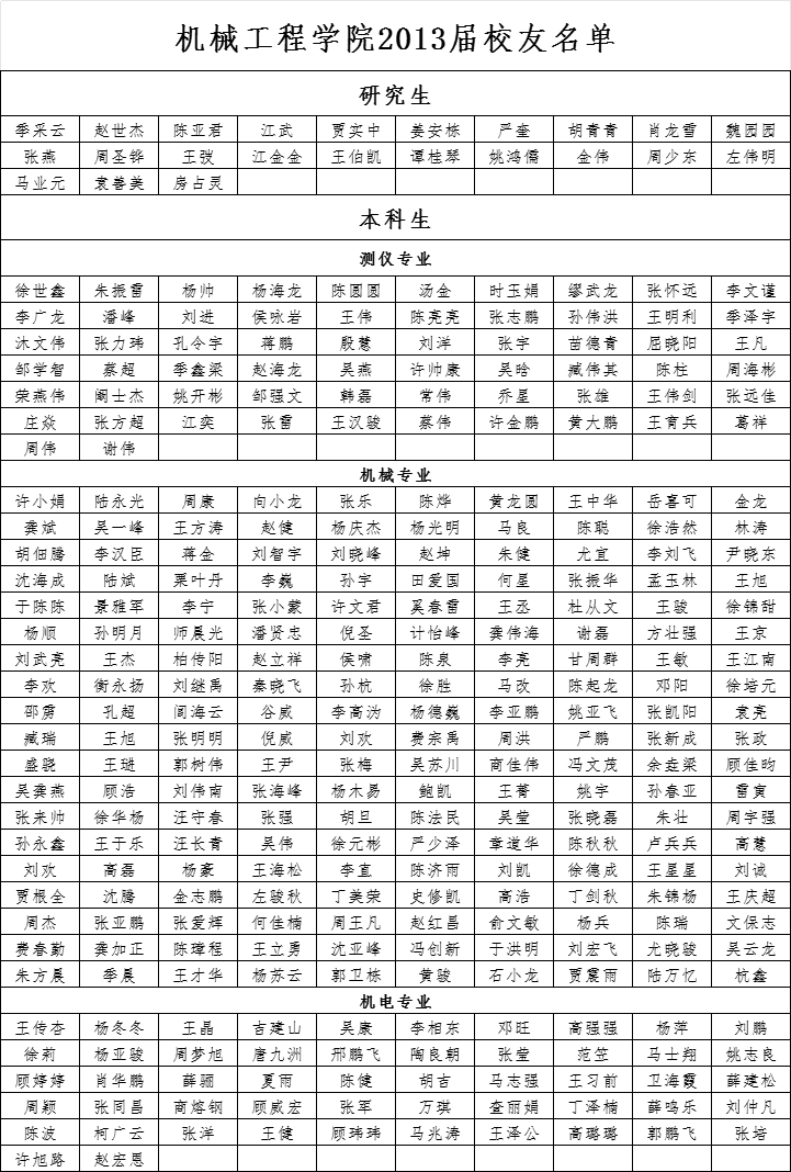 机械工程学院2013届校友名单
