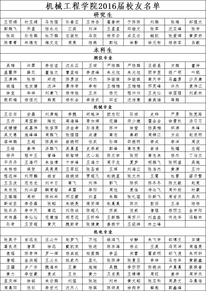 机械工程学院2016届校友名单