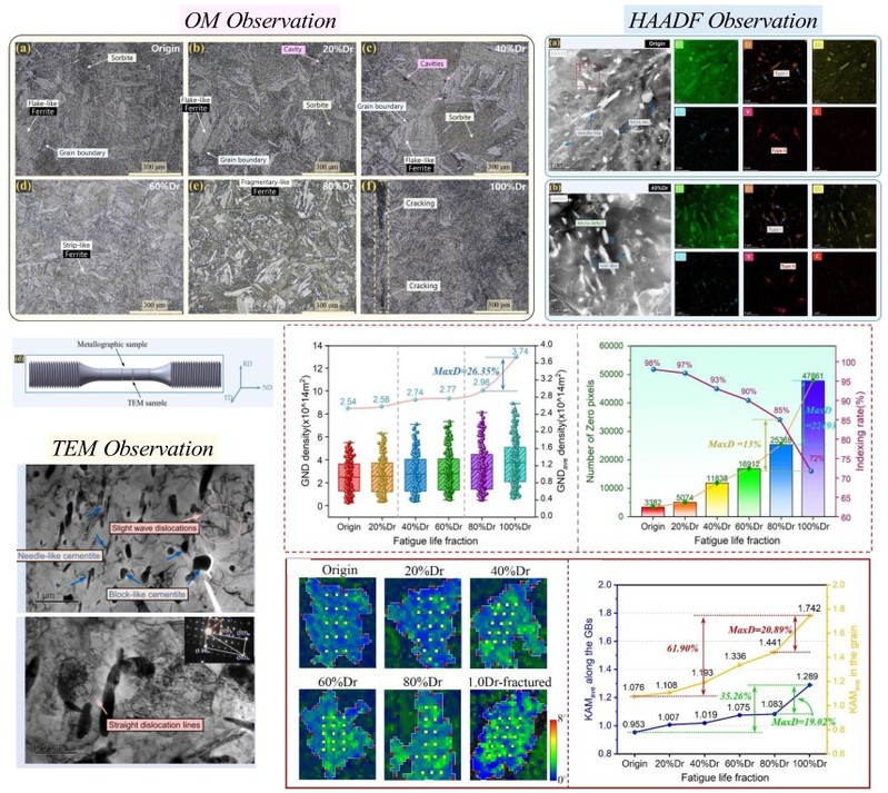 该研究系统地阐述了30Cr1Mo1V转子钢在高温疲劳下的缺陷形成、显微组织演变、损伤演化规律与疲劳断裂机制,并基于晶体学理论提出了一种取向差参数表征法,为精准评估转子钢的疲劳损伤程度、预测转子部件的剩余寿命提供了理论与方法支撑。